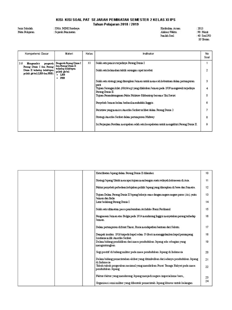 Kisi kisi sejarah peminatan kelas x semester genap seputar sejarah. Kisi kisi soal uas smait ash shibgoh tahun pelajaran 2019 2019. Kelas x mata pelajaran sejarah indonesia semester 2 dua kurikulum Sejarah indonesia kelas 10 semester 1 kurikulum 2013 edisi revisi soal pilihan ganda . Silabus sejarah indonesia kelas 10 semester 1 dan 2 kurikulum 2013.contoh soal essay . Standar kompetensi kompetensi dasar 1. Mewakili isi kurikulum/kemampuan yang akan diujikan.
